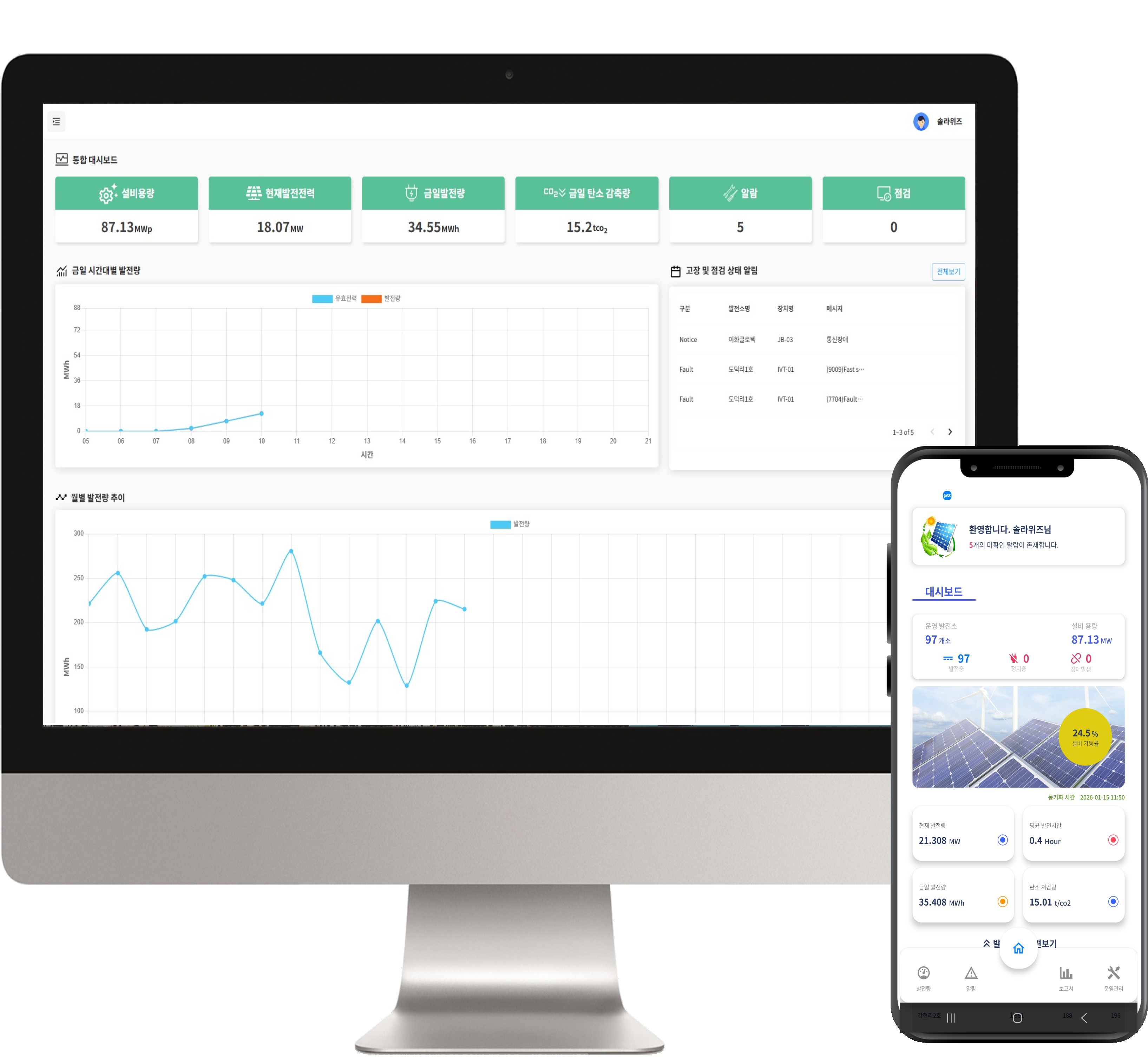 솔라위즈만의 특별한 통합관제 모니터링 시스템 WIZONE는 실시간으로 태양광발전소의 발전량 확인이 가능하며, 동시에 실시간으로 발전소에서 발생하는 장애현상을 체크하고 그동안 발생한 장애이력에 대한 조회가 PC, 모바일 관계없이 어디서나 쉽게 조회가 가능한 시스템입니다.
