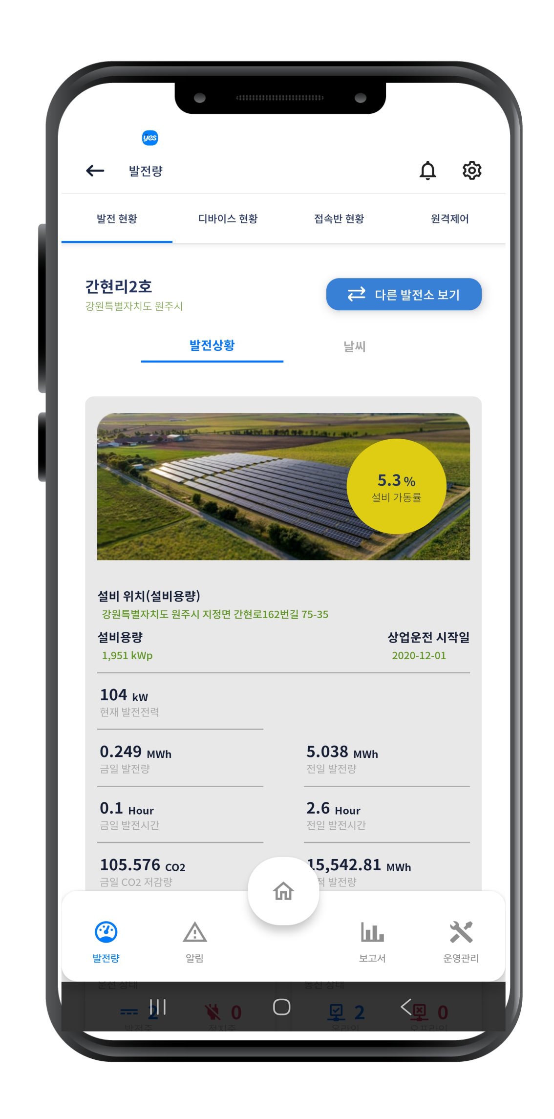 여러 발전소의 발전 종합 정보를 관제할 수 있는 통합관제 기능을 제공합니다. 통합 발전량과 가동률, 장애 발생 현황을 확인할 수 있습니다.